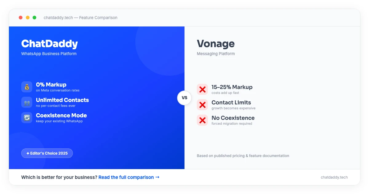 ChatDaddy includes a complete WhatsApp business platform — inbox, AI chatbot, CRM, automation, broadcast — out of the box. Vonage provides only the API layer; everything else requires custom development or additional tools.